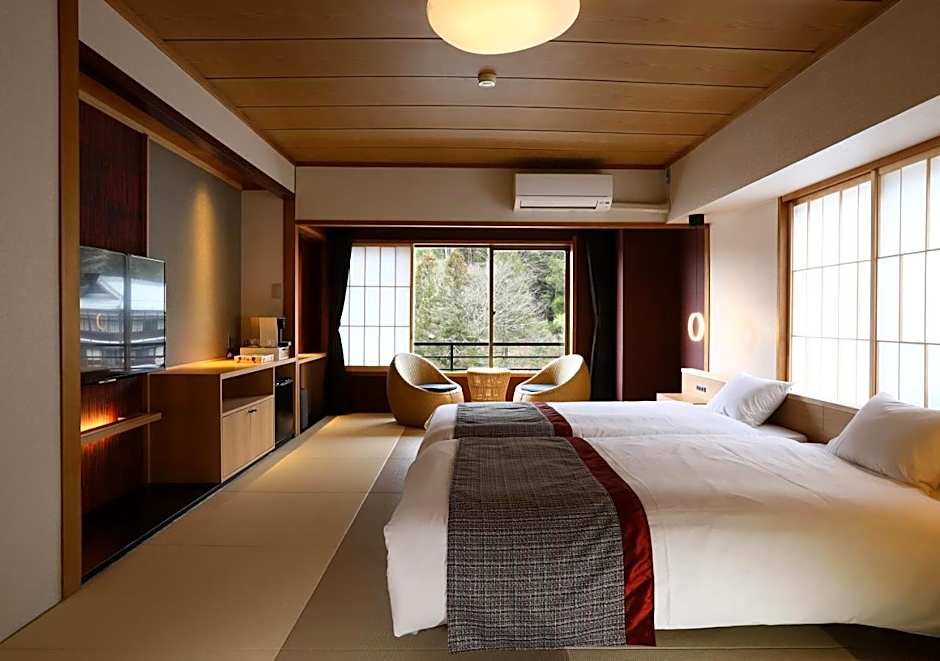 The spacious twin room provides air conditioning, tatami, as well as a private bathroom featuring a bath and a shower. The twin room features a tea and coffee maker, a wardrobe, a safe deposit box, yukata, as well as a flat-screen TV. The unit offers 2 beds.
