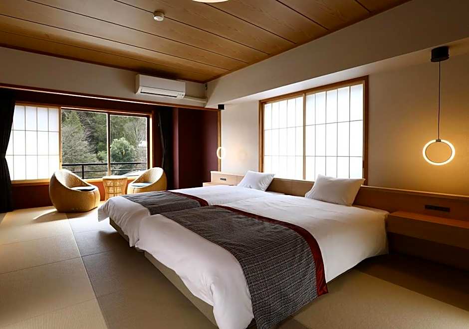 The spacious twin room provides air conditioning, tatami, as well as a private bathroom featuring a bath and a shower. The twin room features a tea and coffee maker, a wardrobe, a safe deposit box, yukata, as well as a flat-screen TV. The unit offers 2 beds.